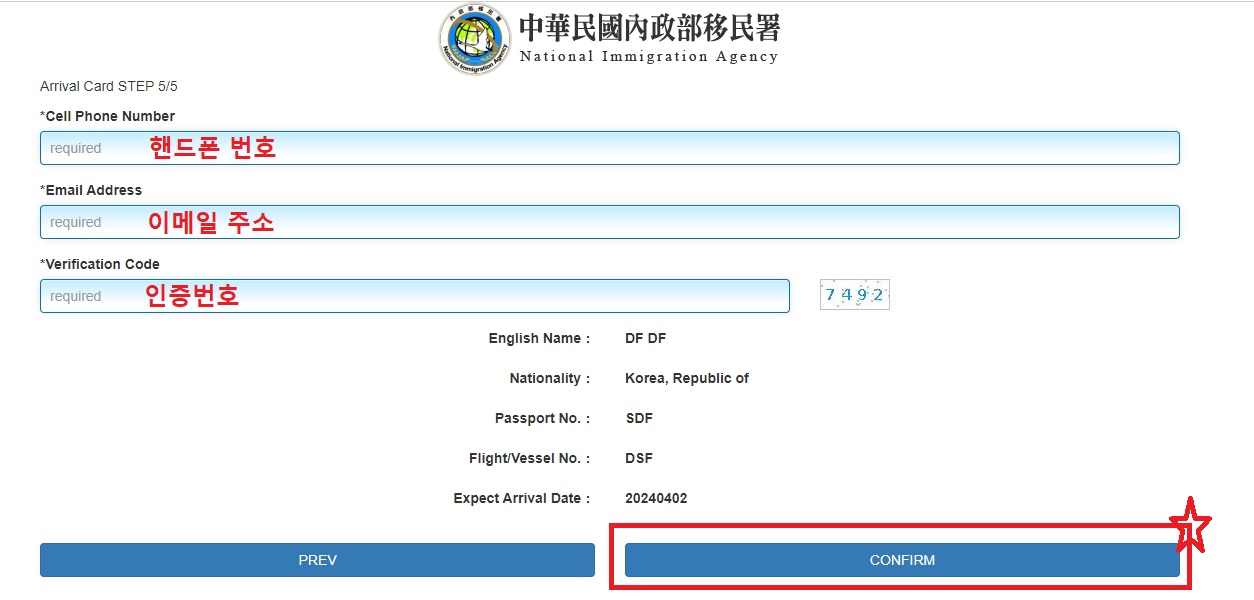 - Expect Arrival Flight/Vessel No. : 대만 입국 시 탑승한 항공편명 (비행기 티켓 확인)
