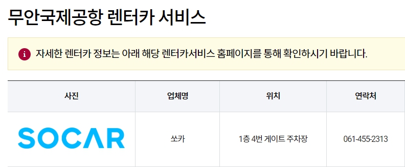 쏘카는 무안국제공항 공식 렌터카 서비스이기 때문에 이용에 장점이 많으니 렌트카를 이용하실 분들은 참조 부탁드립니다.
