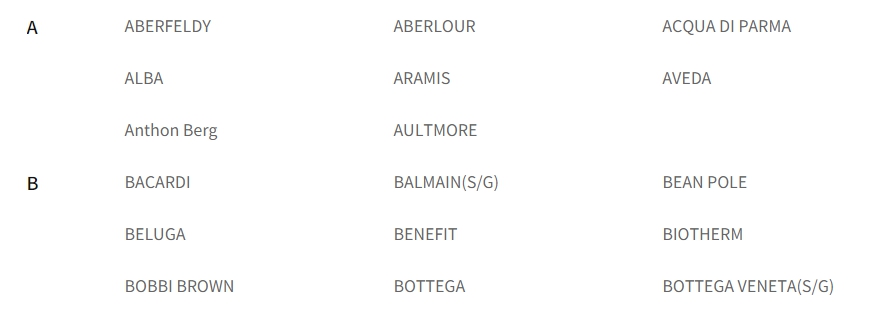 브랜드가 많은 관계로 일일이 나열할 수 없는 점 양해 부탁드리며 아래 입점 브랜드를 통해 확인하실 수 있습니다.